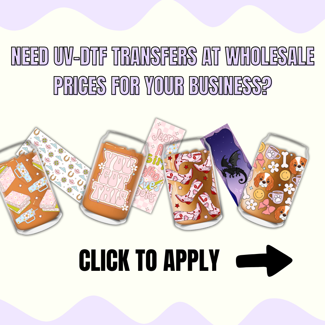 Need bulk UV-DTF Transfers at wholesale prices for your business? Join our wholesale program and get access to all designs on our website at wholesale prices , plus first access on new design drops!